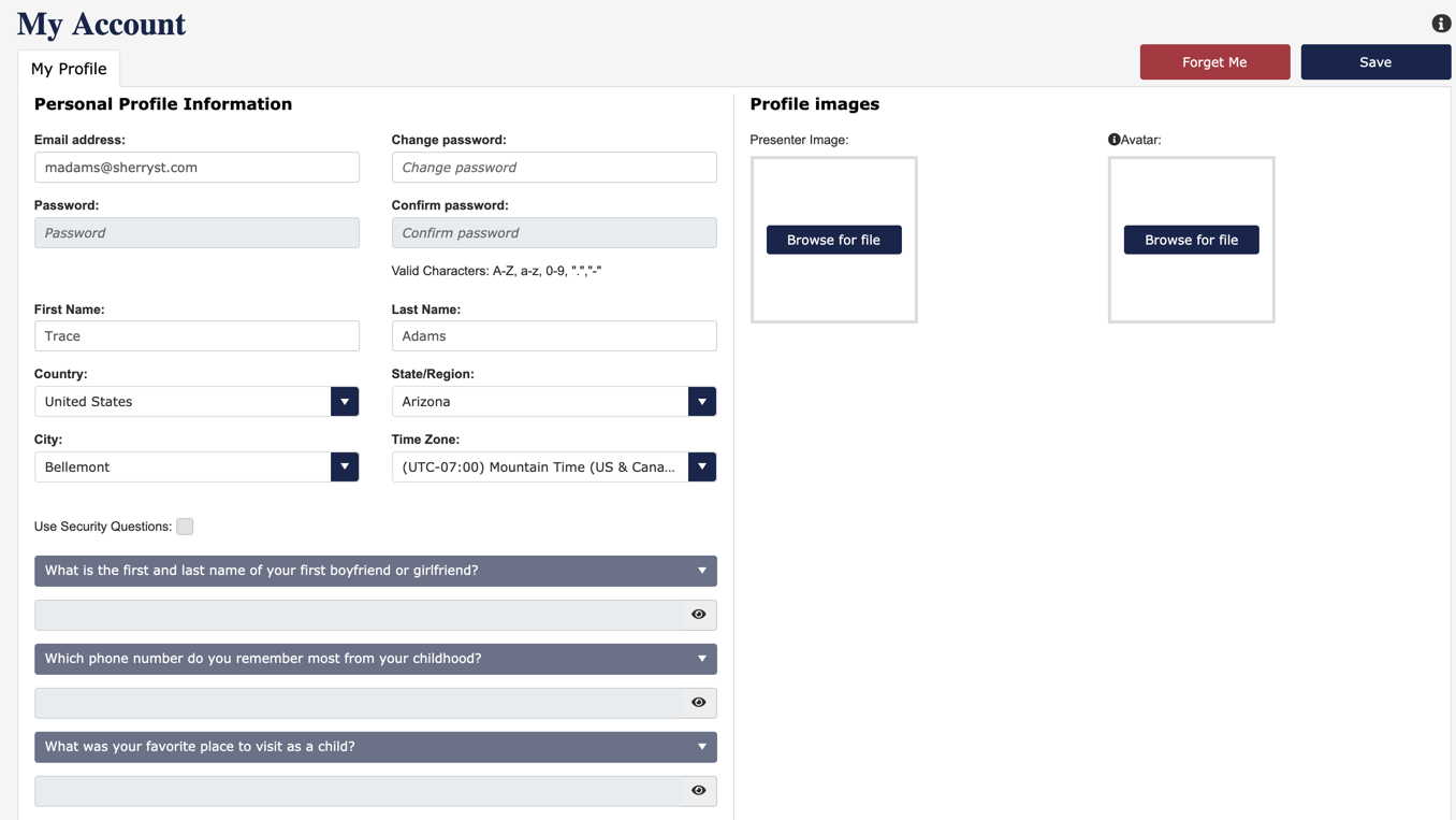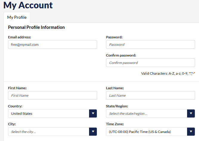 A: Click "Register Now" on the login page, and fill out the "My Account" form, including security questions.