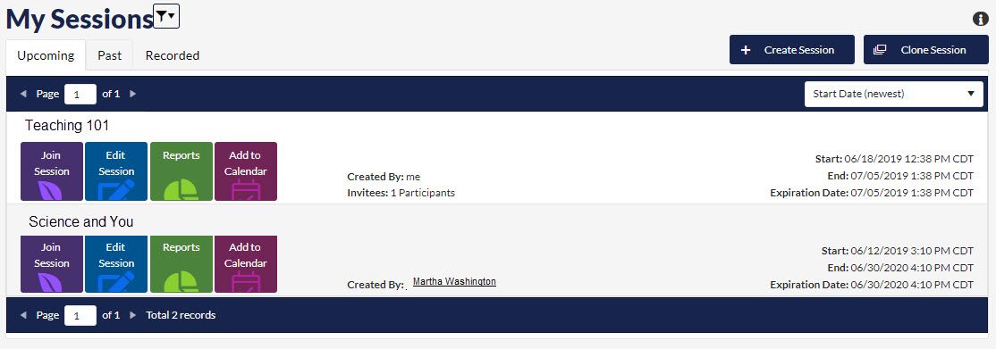 A: You'll be directed to the session screen, showing the list of sessions you're invited to or have created.