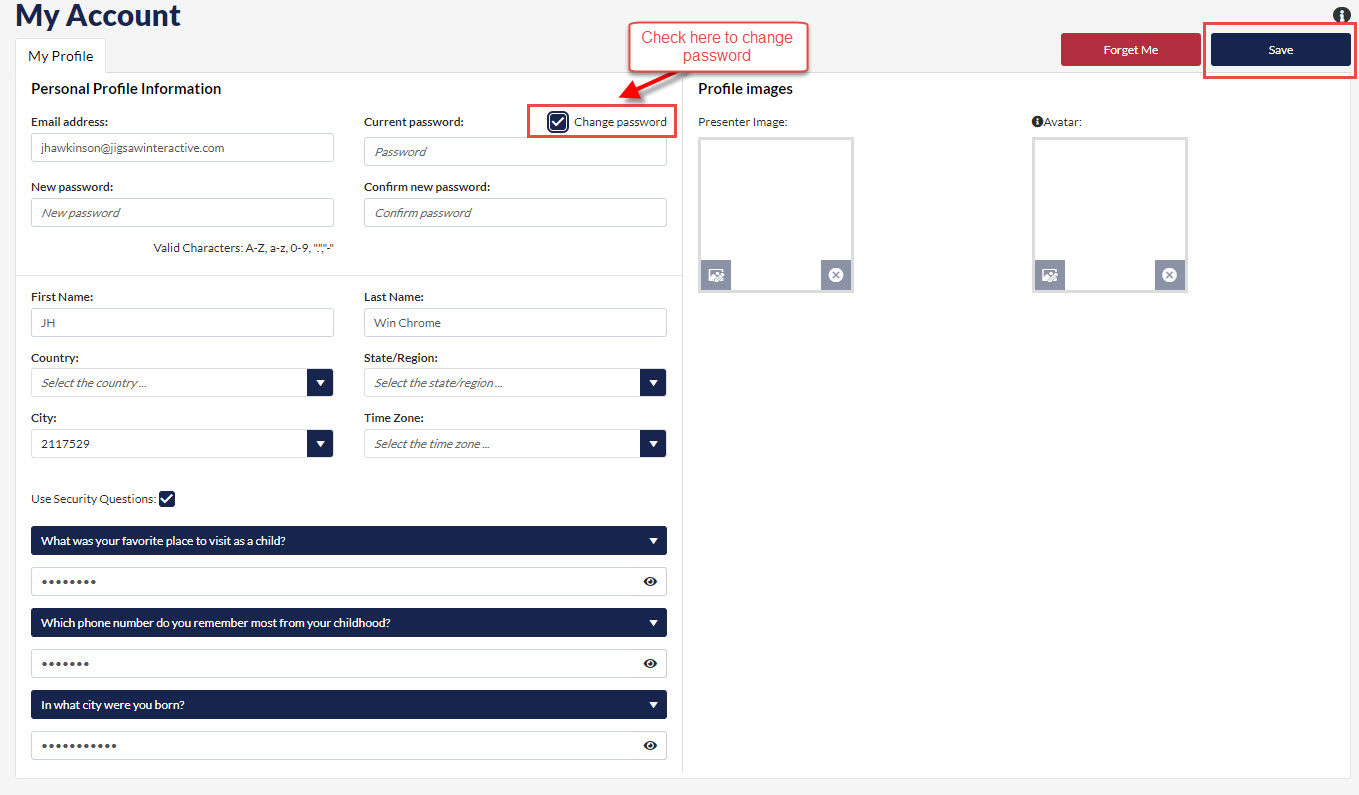 The online password reset allows existing Jigsaw users the ability to add security questions to their profile so that they can reset their password online.