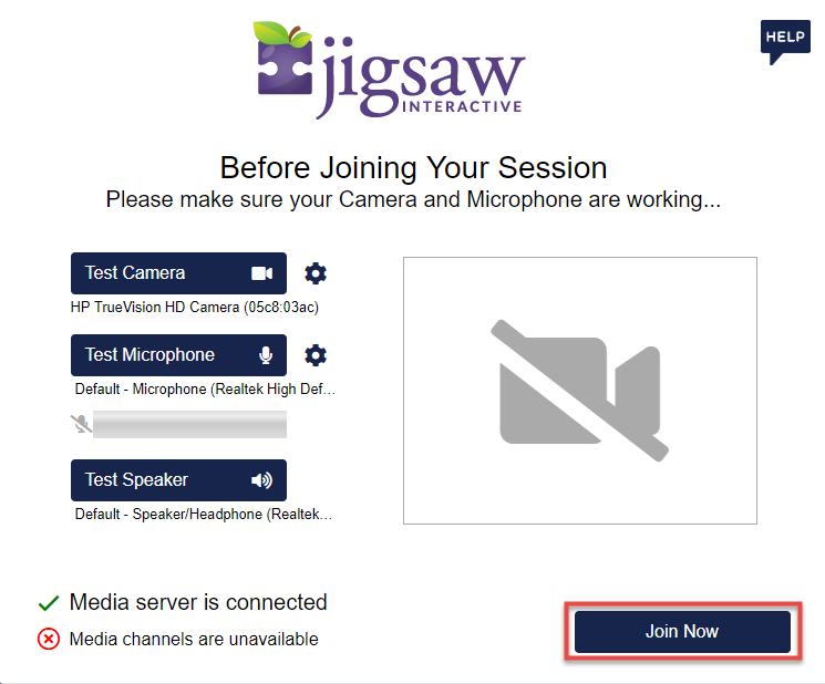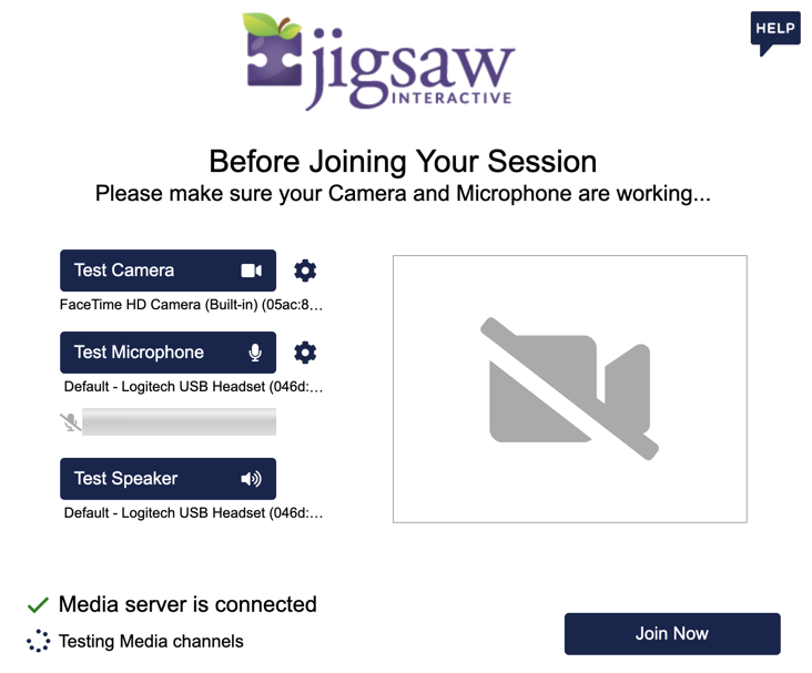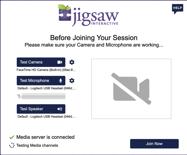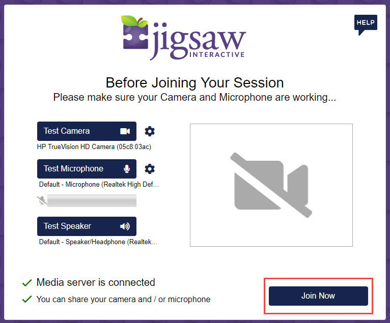 5. Jigsaw gives you the opportunity to test your Camera, Microphone, and Speaker before joining. Once you are ready, click Join Now.