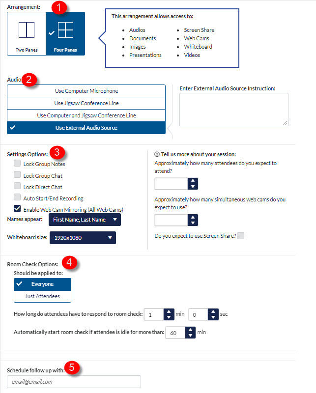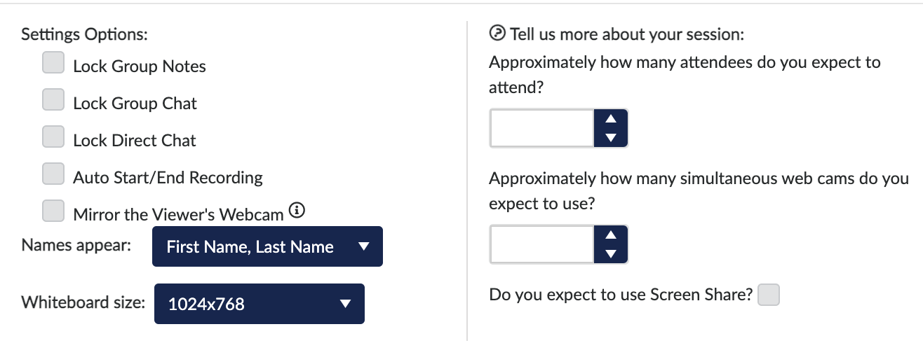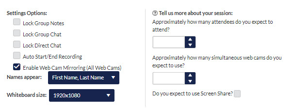 You can also provide some general information regarding your session such as the expected number of attendees, number of web cams that will be on at once, and if you will be screen sharing.