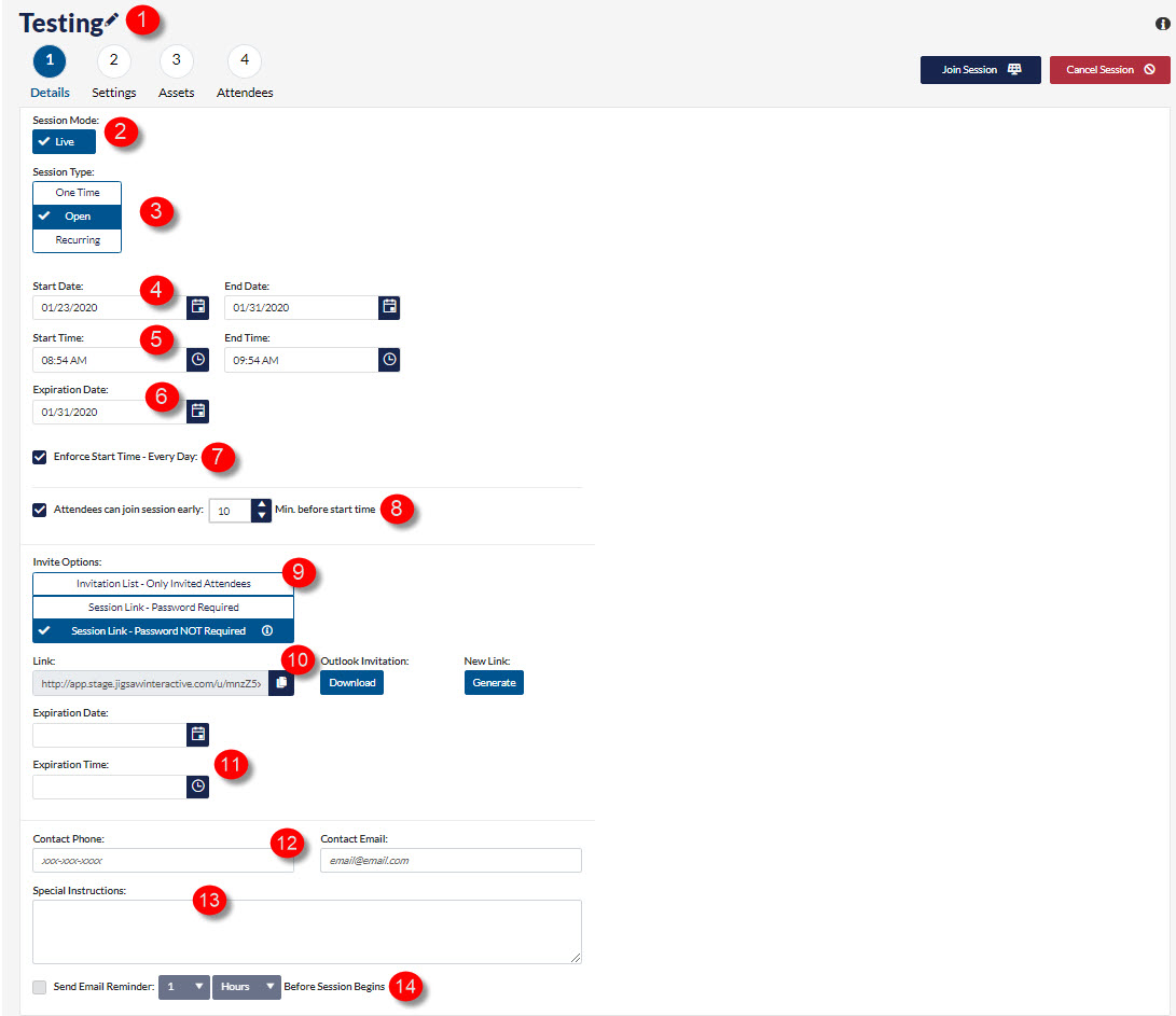 The time the session is to start and end. Sessions may exceed the end time if attendees are currently in it. However, no one may join beyond the end date and time unless the Can Be Joined Until date has been extended.