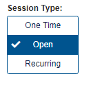 Open - This spans over a date range and time. It creates one session that is open during the designated date, days of week, and time. The Days of Week will appear when a range of dates spanning more than one day are entered.