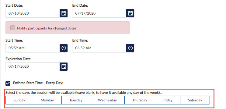 When an Open Session spanning 2 Days or More is set, the Days of the Week is visible. Select the Days that the session will be held. If Attendees attempt to join the session during the dates, but on a day not selected, they will receive a message saying which days the session is available.