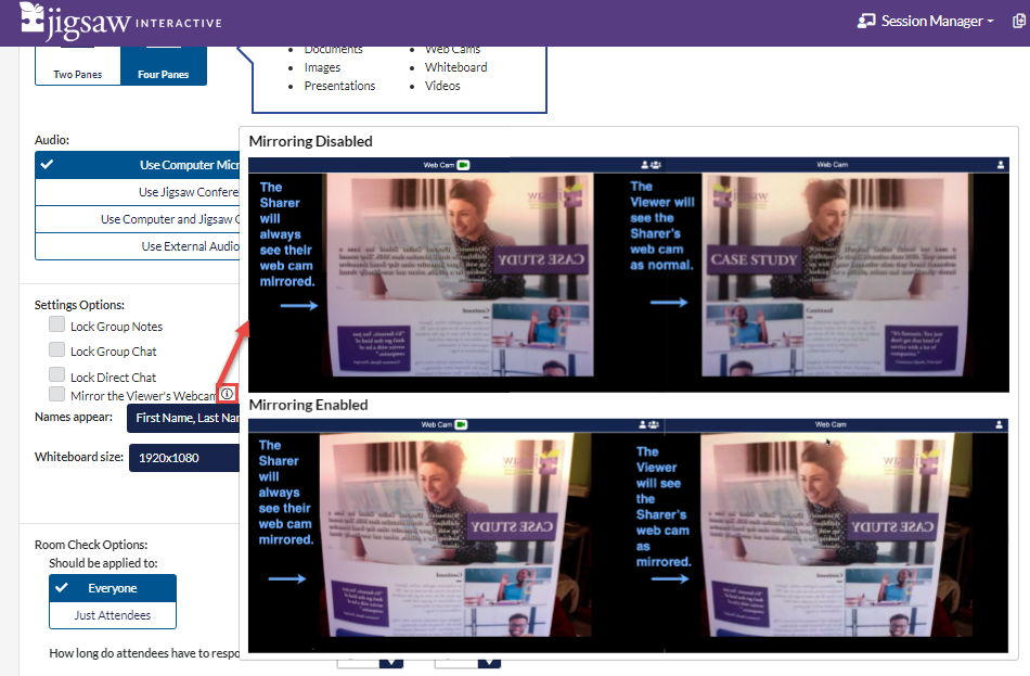 - Mirror the Viewer's Webcam - When unchecked, attendees in the session will be able to read anything that is displayed by another user's web cam correctly. The user displaying the item being read will still see the item backwards. For more information on how Web Cam Mirroring works, click the information icon next to the Mirror the Viewer's Webcam.