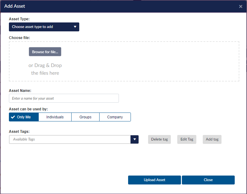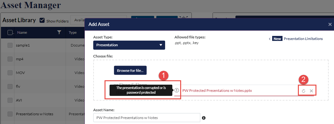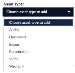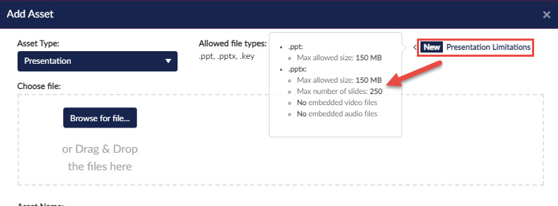 **Please Note: The maximum size an asset can be when uploading is 2 GB. For Presentations, the limit is set to 150 MB. When selecting Presentations from the Asset Type drop down, a New popup is available outlining the Presentation criteria.**