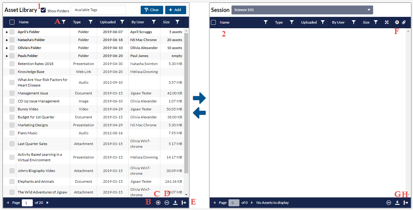 Everything else works the same as the Session Asset Library. You can refer to the information for Using the Asset Page to learn more.