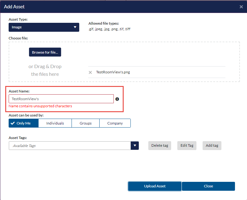 If you attempt to upload an asset with an unsupported symbol/character, you will receive a message informing you of the error.