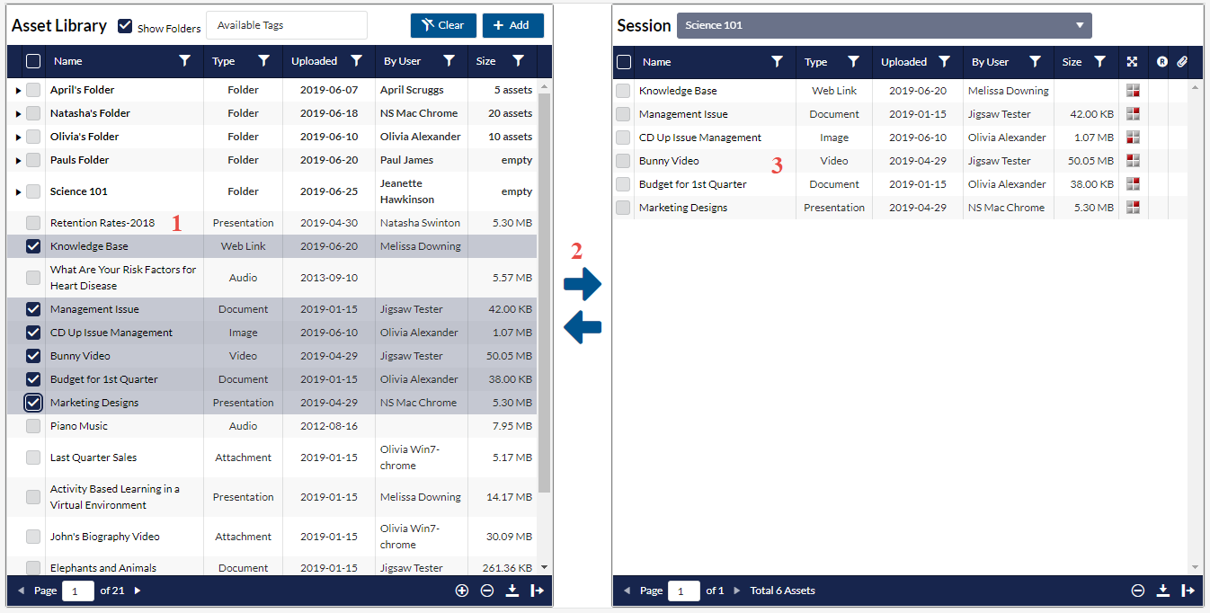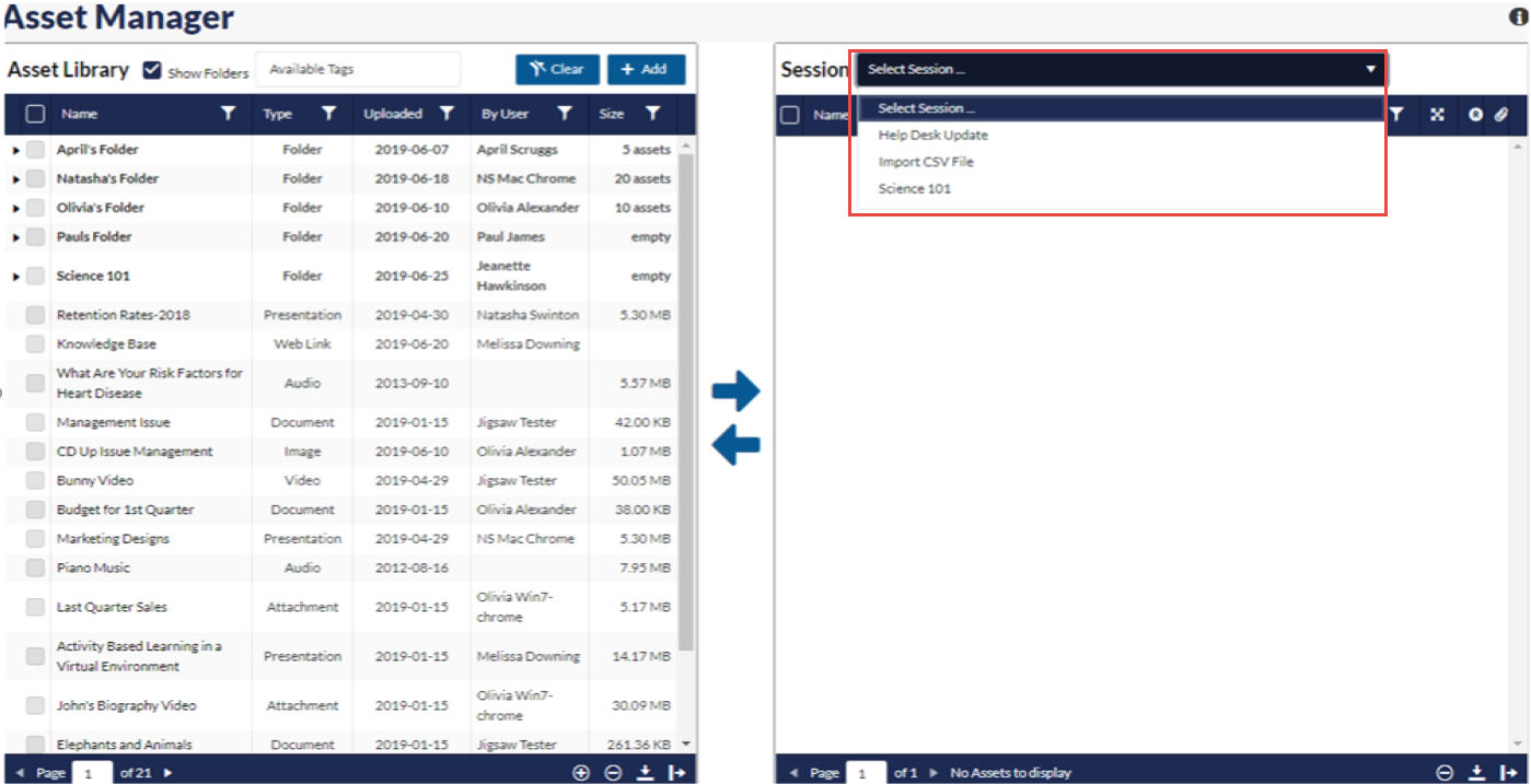 You can easily add assets to your session during the creation process. During Step 3 of creating a session, you can move assets from the library to your session.