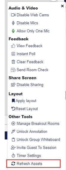 If assets are added to your session while you are hosting the session (the session is Live), you will need to click Refresh Assets under the Global Attendee Options menu (located at the top of the Attendees list).