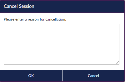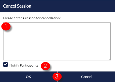 3. The Cancel Session dialog box opens. First, enter the details for cancelling the session. Next, select whether to notify attendees of the cancellation (by default this is checked, if you do not want attendees to receive an email about the cancellation, uncheck this box). Click OK to proceed.