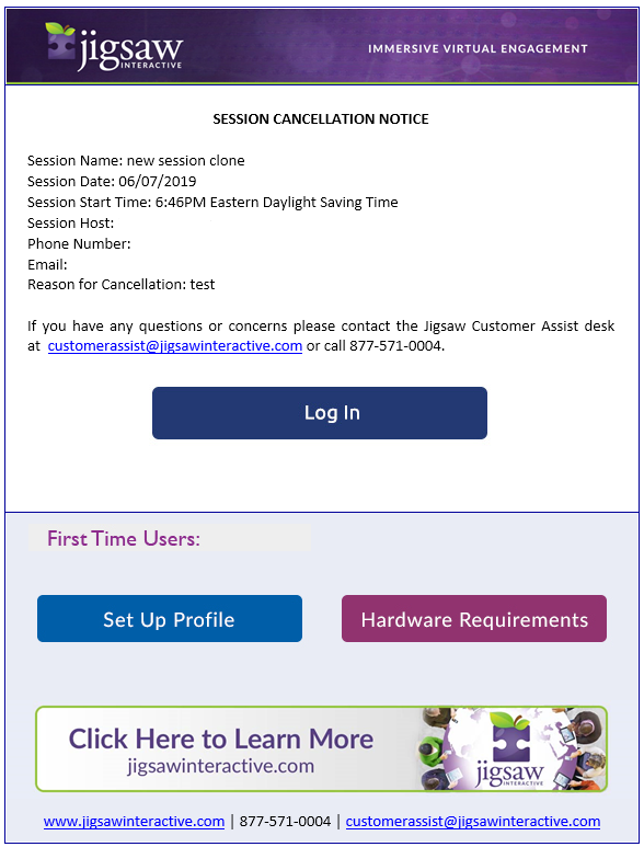 A: Jigsaw will send the Host a cancellation email and the session is removed from Upcoming Sessions. Once a session is cancelled it cannot be restarted; however, any recordings associated with the session are maintained. If selected, attendees will also receive a cancellation email.
