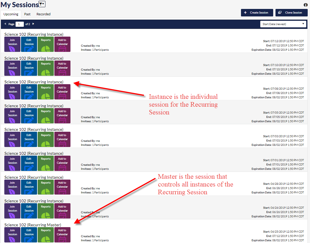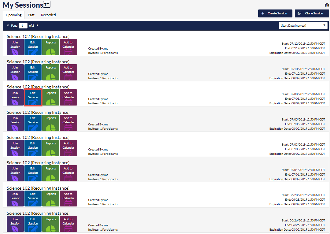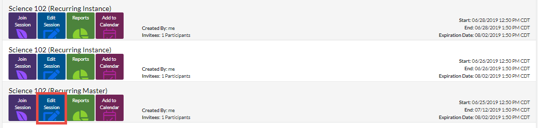 1. Locate the Recurring Master on the My Sessions screen and click Edit Session.