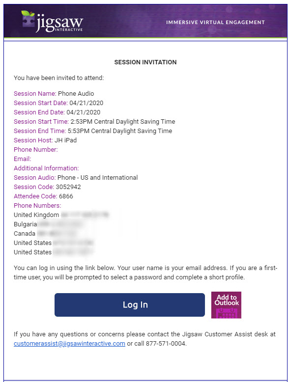 3. From the Upcoming Sessions page when the Attendee logs into Jigsaw, there is an Add to Calendar button. When the Attendee opens that calendar event and adds the event to their online calendar, it will include the Session Code and Attendee Code.