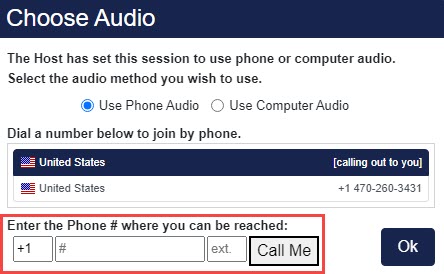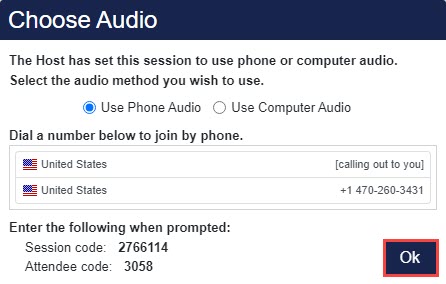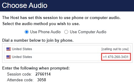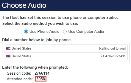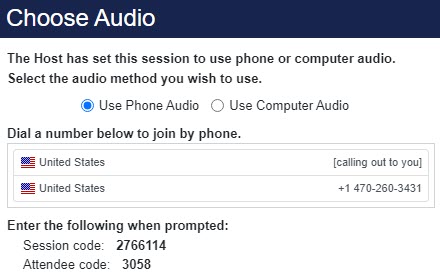 When a session is set to use phone or computer audio, attendees will make the audio selection when joining the session.