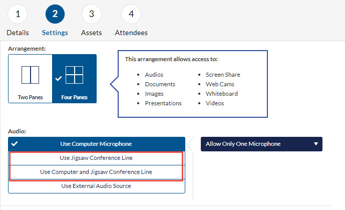 A: It is an add-on feature that utilizes a built-in conference line that works for local or international calls. Because the audio is integrated it offers attendees the option of using "Computer" or "Phone" audio while in a session, and it works nicely with Jigsaw's Server Side Recording and in Breakout Rooms.