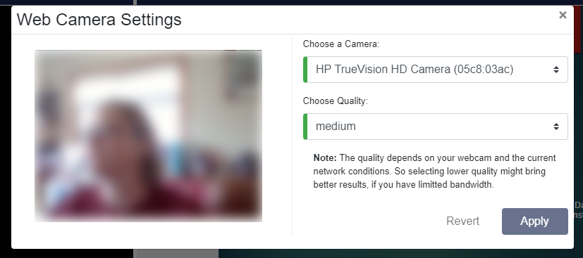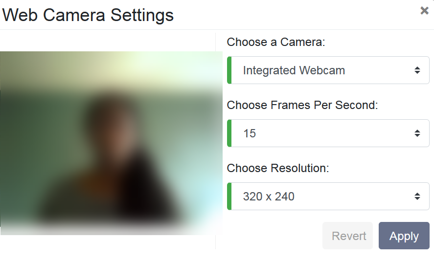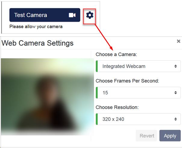 By clicking the gear icon, you can further adjust the web camera settings such as camera selected, frames per second or resolution.