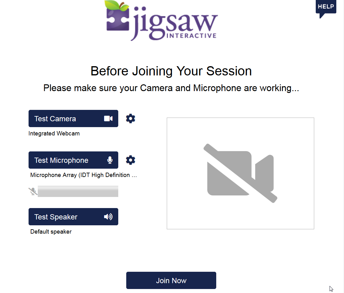 Before entering a session you can test your camera, microphone and speakers ensuring they are ready to be used in a Jigsaw session.
