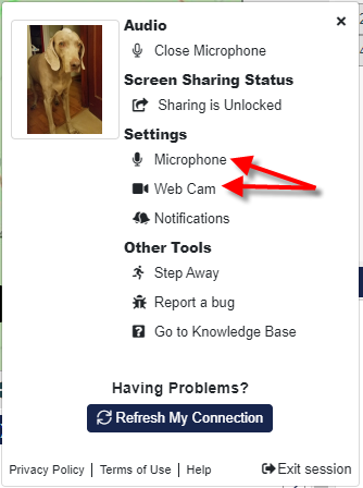 1. If you see that your microphone and/or web cam are red in the Attendees List, this usually means the browser is blocking access to those tools.
