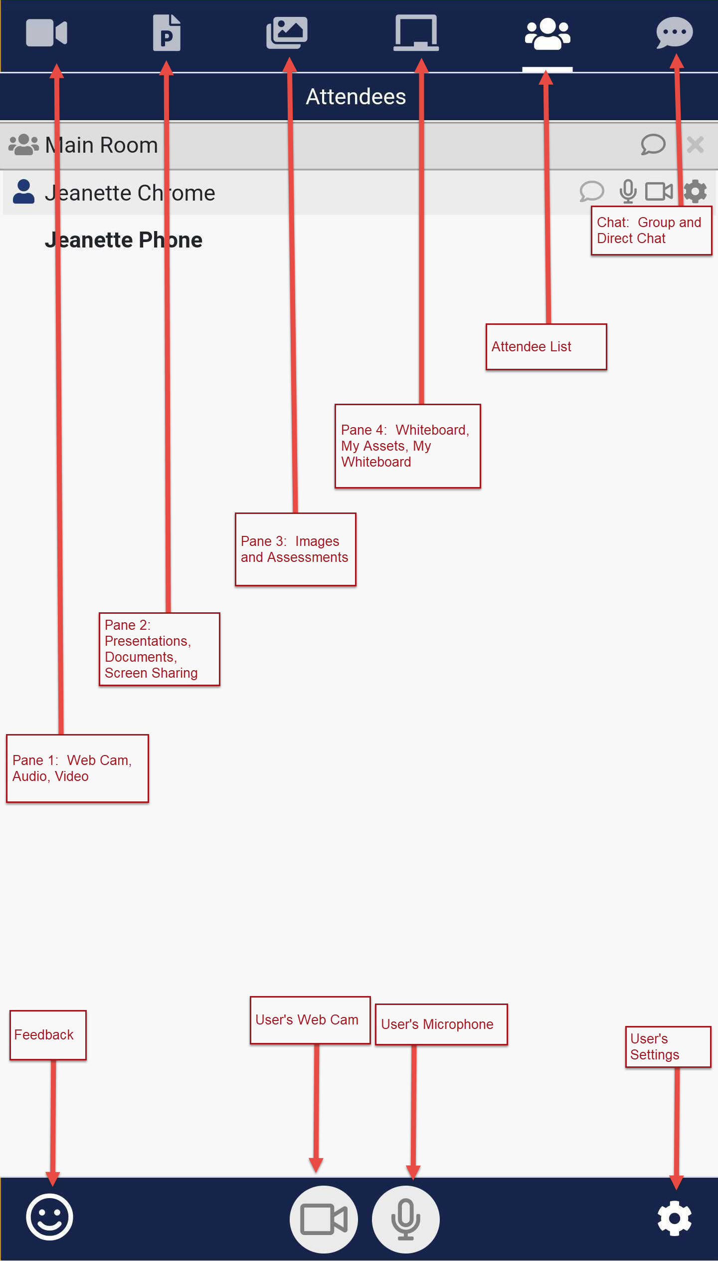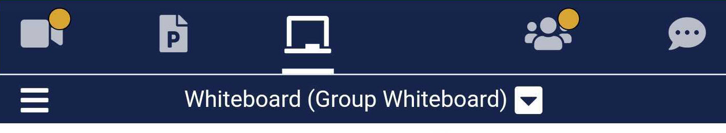 To activate the different panes, the Mobile Phone user will click the icon for the Pane to be viewed. The user will also be notified when new content is ready to be viewable by seeing a yellow dot appear at the top of the Pane's icon. If the Host has set up a session or a Breakout Room with specific panes visible, the icons for the panes not visible will not appear in the Navigation bar.