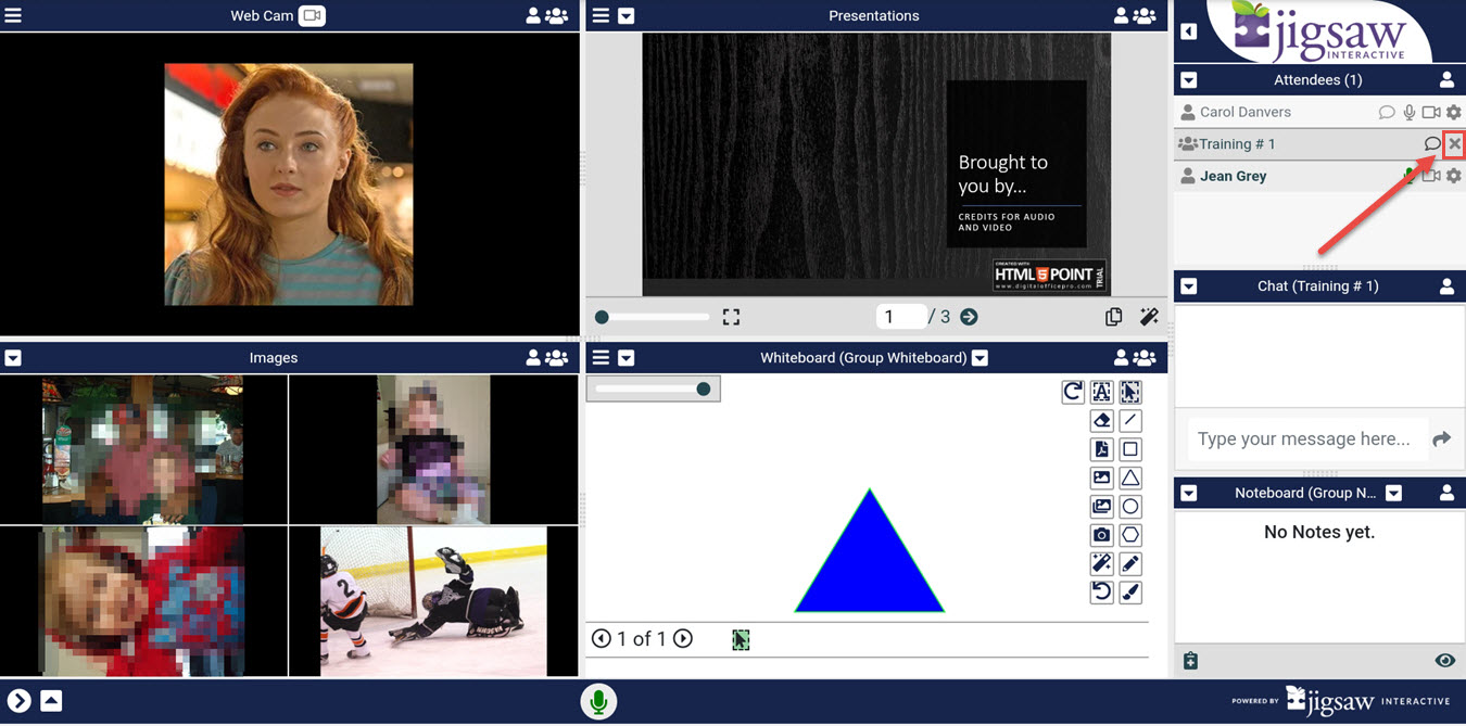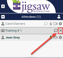 To exit the Breakout Room and return to the Main Room of your Jigsaw session, click the X by the name of the Breakout Room in the Attendee List.  You will immediately be taken back to the Main Room.