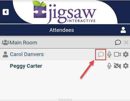If Direct Chat is enabled, you will see chat bubbles next to the names of everyone else in the session. Click on a bubble to send a direct message to that person.
