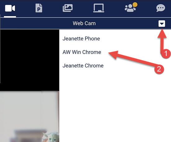When Web Cams are turned on, the Mobile Phone user will see the primary camera that was selected by the Host or Co-Host. A drop-down arrow will appear in the upper right corner. Click the arrow to drop down the list of available cameras, then select the camera to change the view in Pane 1.