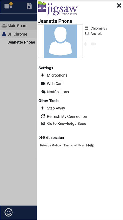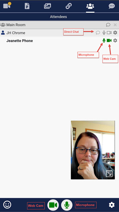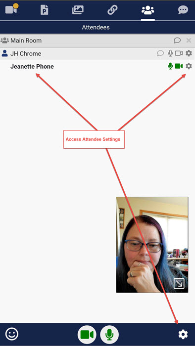 The settings gear located to the right of the attendee's name and at the bottom right of the Mobile Phone user's session window provides some important settings for the attendee to control. The same menu can be accessed by clicking the Attendee's name.