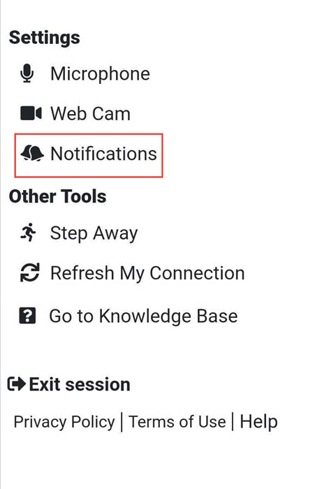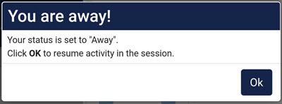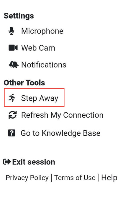If the attendee needs to step away from the session, clicking this will alert the host and/or co-host that the attendee is not currently participating in the session. The attendee will see a message appear on the screen confirming the status is set to "Away" and a Step Away icon will appear next to the Attendee's name in the Attendees List.