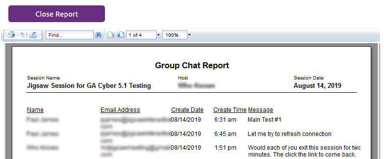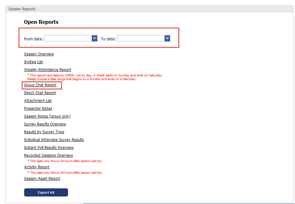 The session Host (the person who created the session) can view and export reports. The Group Chat Report includes all group chat notes from the group chat area.  This report is available after the session has ended.