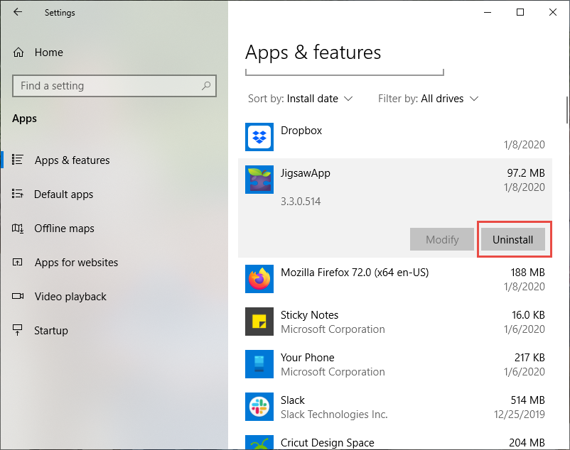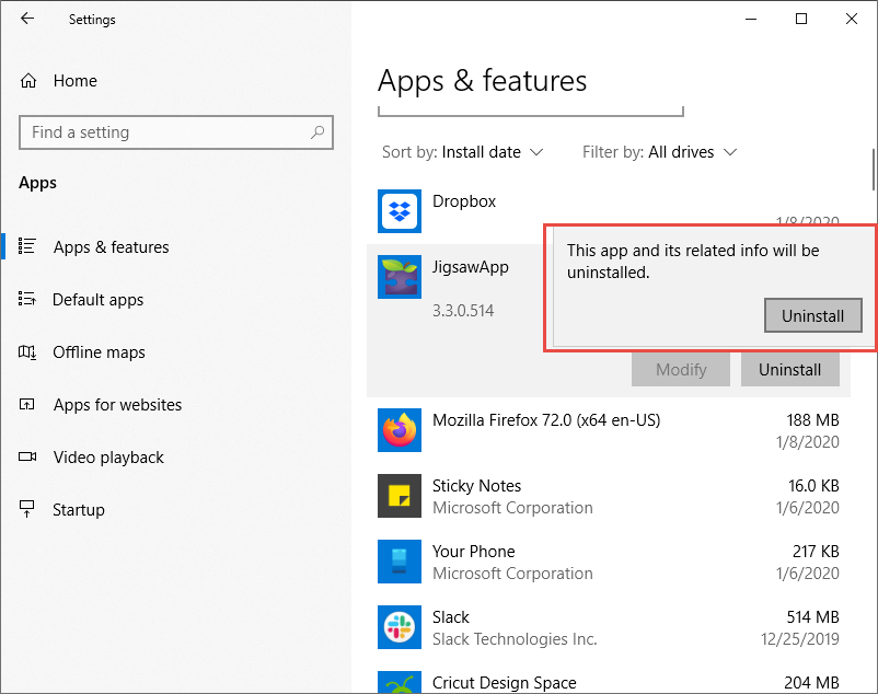 4. Locate the Jigsaw App in the list of Apps & features (you can also search the list by entering Jigsaw App in the search box) and click Jigsaw App.