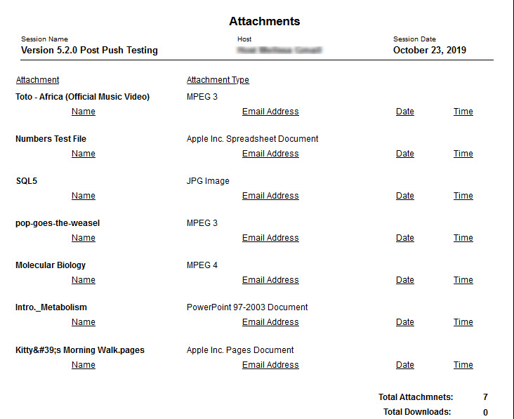 The session Host (the person who created the session) can view and export reports. The Attachment List includes a list of all attachments uploaded with download time, date, and individual information, as well as when and if the Attachment has been downloaded.  This report is available after the session has ended.  If an Attachment has been subsequently removed from the session, it will not show on this report.