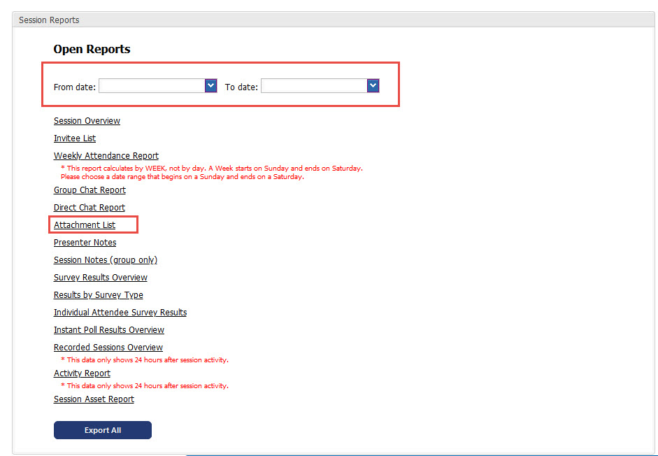 3. Enter the date range and choose Attachment List.  Please Note:  If no filter dates are entered, ALL Attachments for this session for every date the session has been opened.