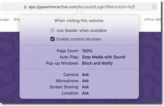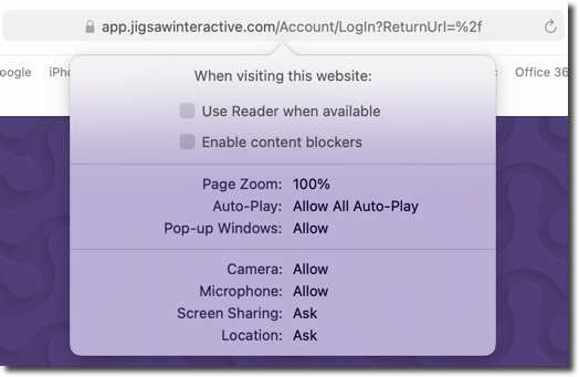 Each browser has unique settings that can be enabled when using your camera and microphone within the browser. To ensure a seamless experience between Safari and Jigsaw, "allow" your camera and microphone within the browser settings.