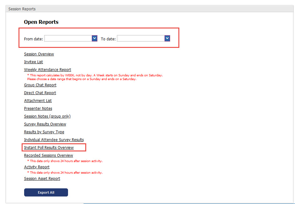 The session Host (the person who created the session) can view and export reports.  Co-Hosts also have access to Reports for sessions in which they are assigned.  The Quick Poll Overview displays results by question for each attendee, in alphabetical order.  This report will be available after the session has ended.