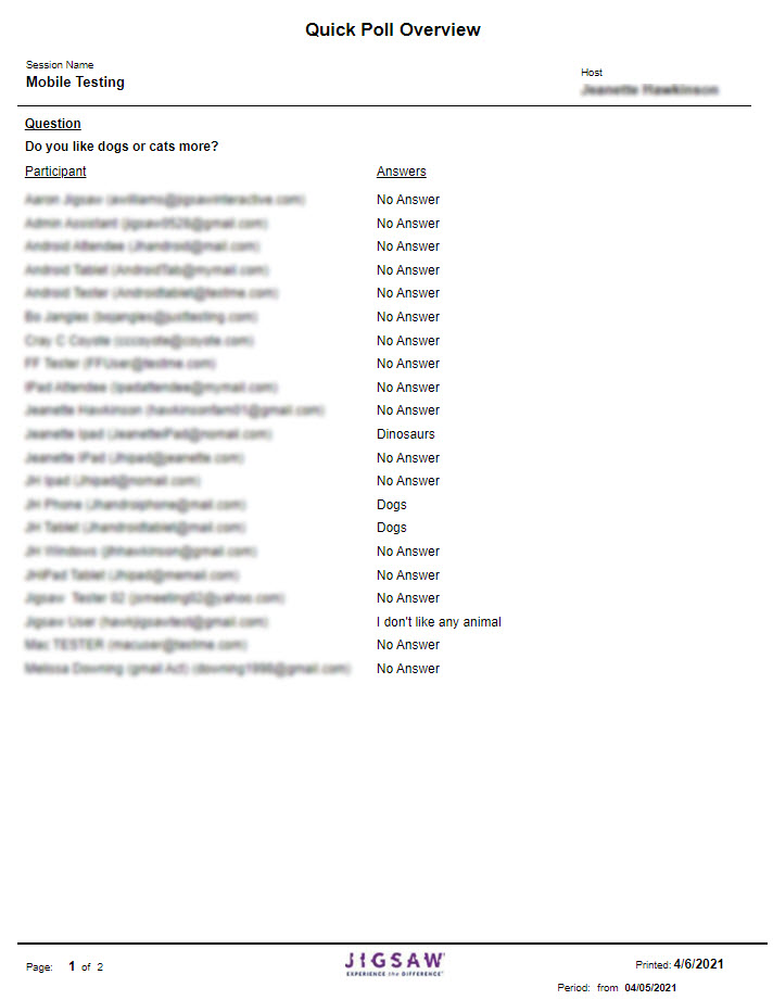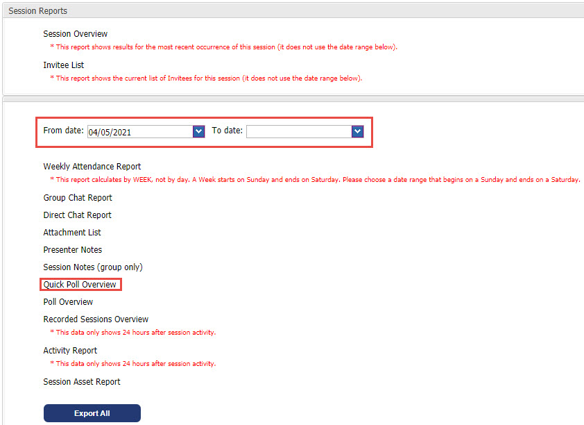 Please Note:  If a Quick Poll is taken several times during a session, all results will be available in the Quick Poll Overview report.  The newest results will appear at the beginning at the report.