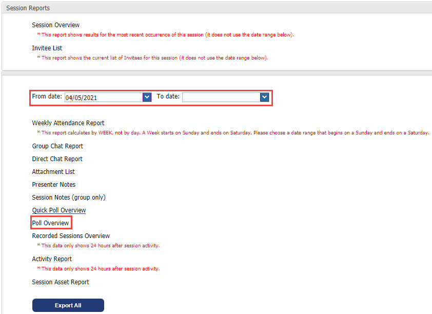 The session Host (the person who created the session) can view and export reports. Co-Hosts also have access to Reports for sessions in which they are assigned. The Poll Overview displays results by question for each attendee. This report will be available after the session has ended.