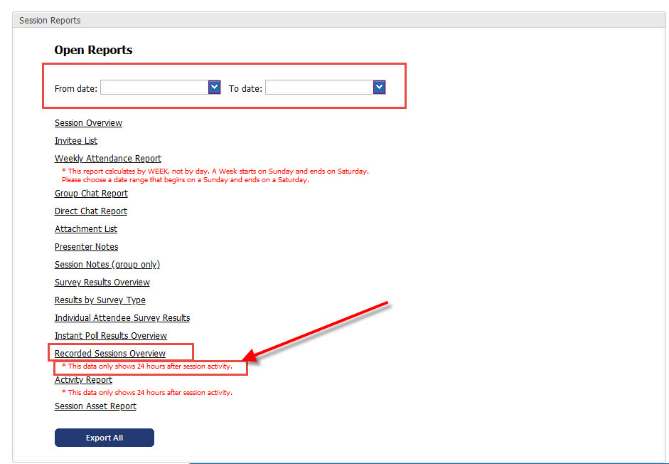 3. Enter the date range and choose Recorded Sessions Overview. Please note: If no filter dates are entered, ALL Activity for every session opened will appear in the report.