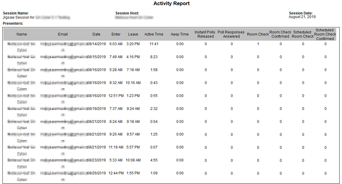 The session Host (the person who created the session) can view and export reports. The Activity Report calculates 24 hours after the last session activity. This report tracks the following: