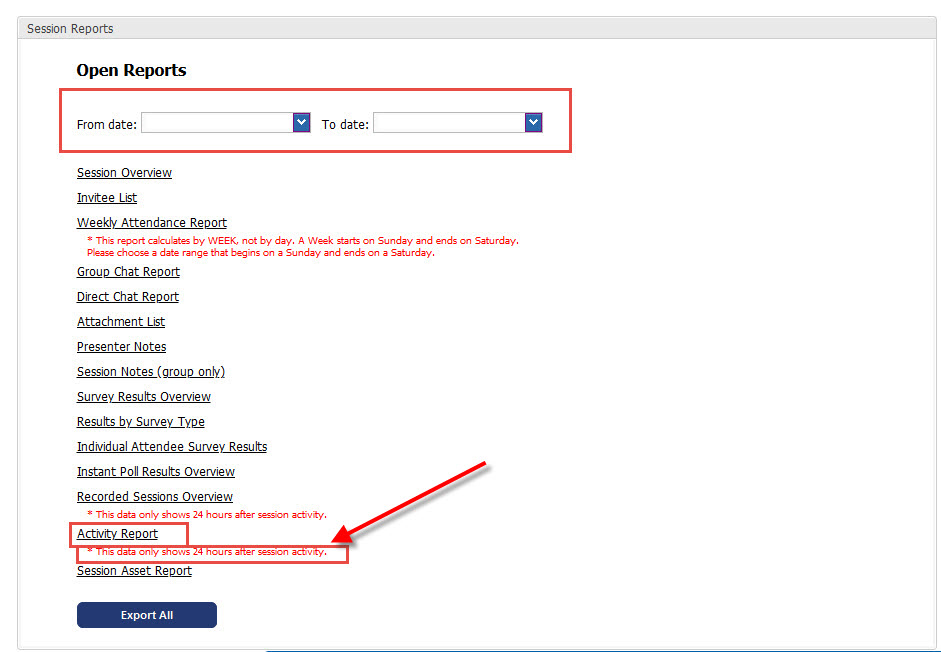 3. Enter the date range and choose Activity Report. Please Note: If no filter dates are entered, ALL Activity for each session opened will appear in the report.
