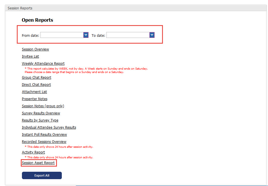 3. Enter the date range and choose Session Asset Report.  Please Note:  If no filter date is entered, ALL Activity for each session date will appear in the report.