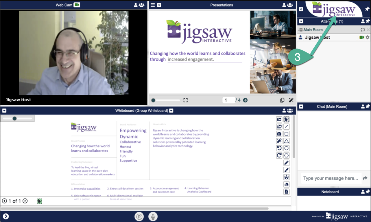 2. Within the session, the same logo will appear in three locations: Above the Attendee List, Pane 1 when there is no presenter image or when Audios are playing, and Pane 4 when Audios are playing.
