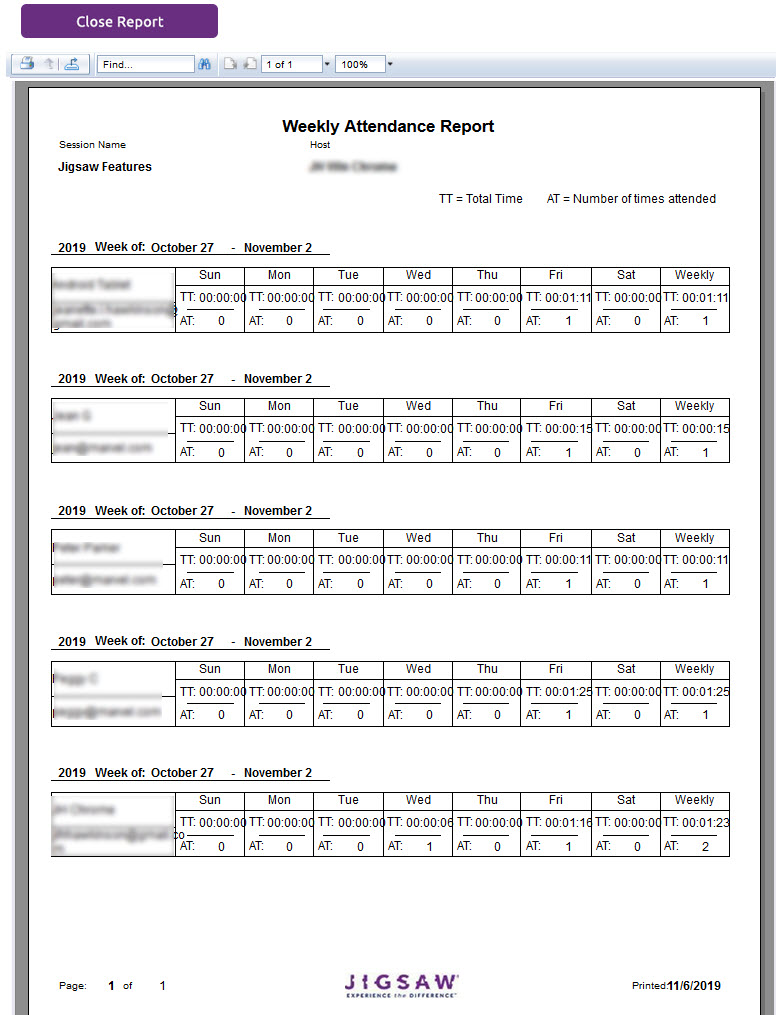 The Weekly Attendance Report shows the total number of times that an attendee joined the session by day and a weekly total time.