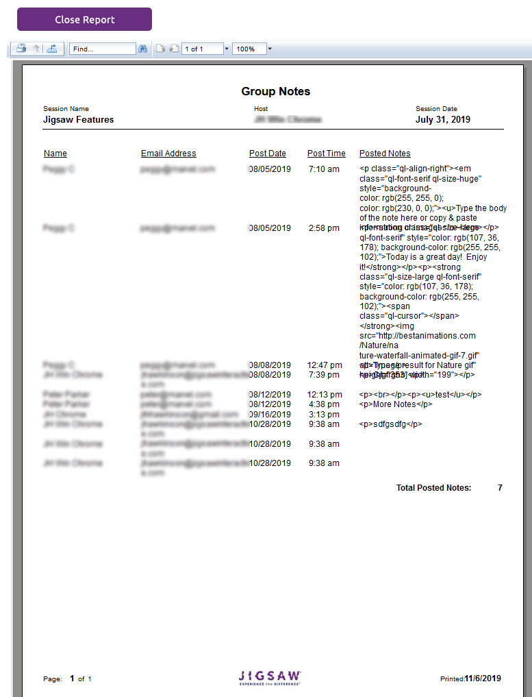 The session Host (the person who created the session) can view and export reports. The Group Chat Report includes all chat notes from the group chat area.