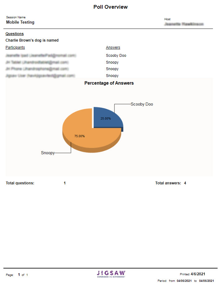The Poll Overview displays results for each question from the Polls taken by each attendee in the session.