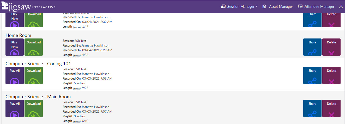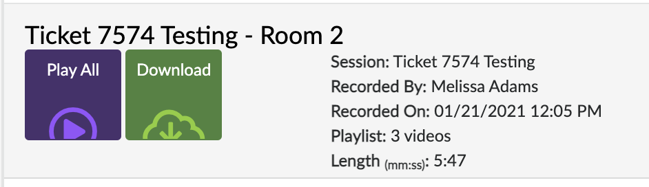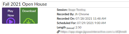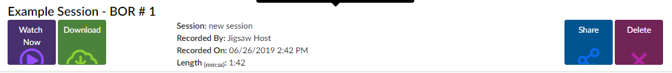 Note: Because we must copy the file from the recording machine over to the session server and depending on the size of the recording, it could take several minutes for the recording to be ready to view, share, or download. So, please allow 5 minutes to 10 minutes for the recording to appear.