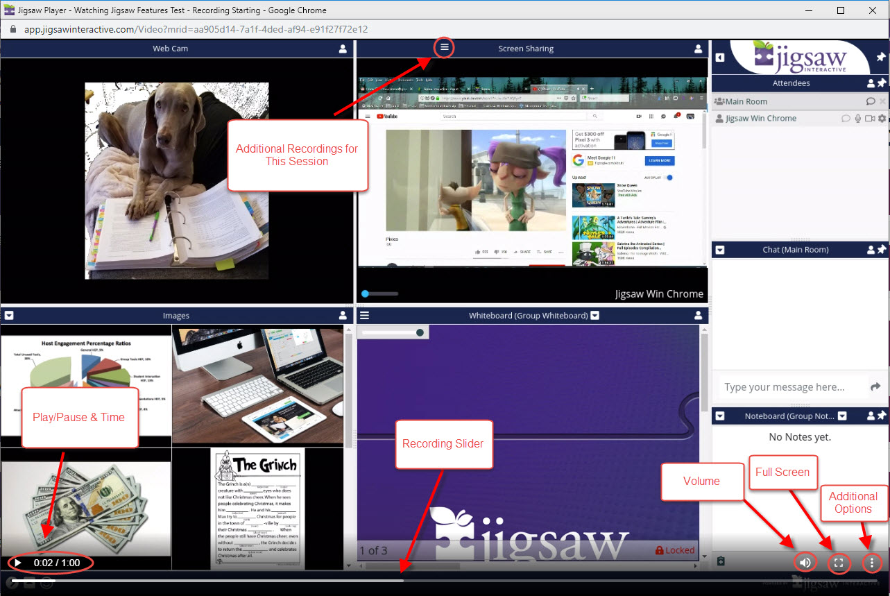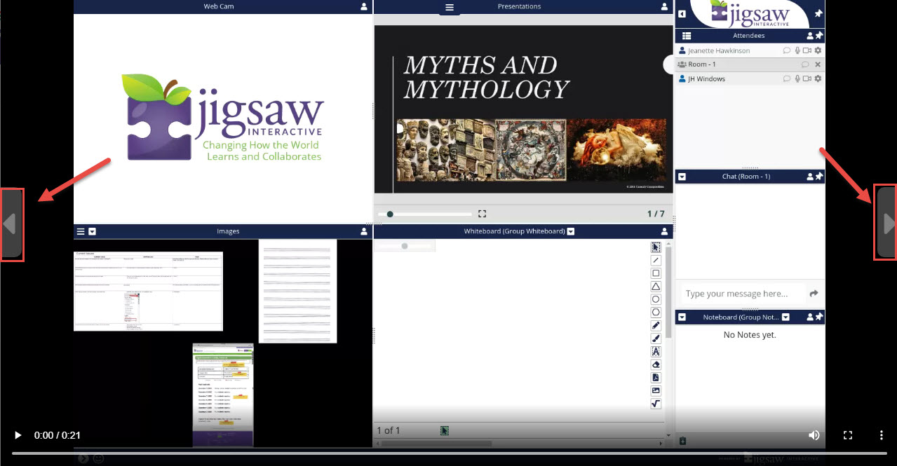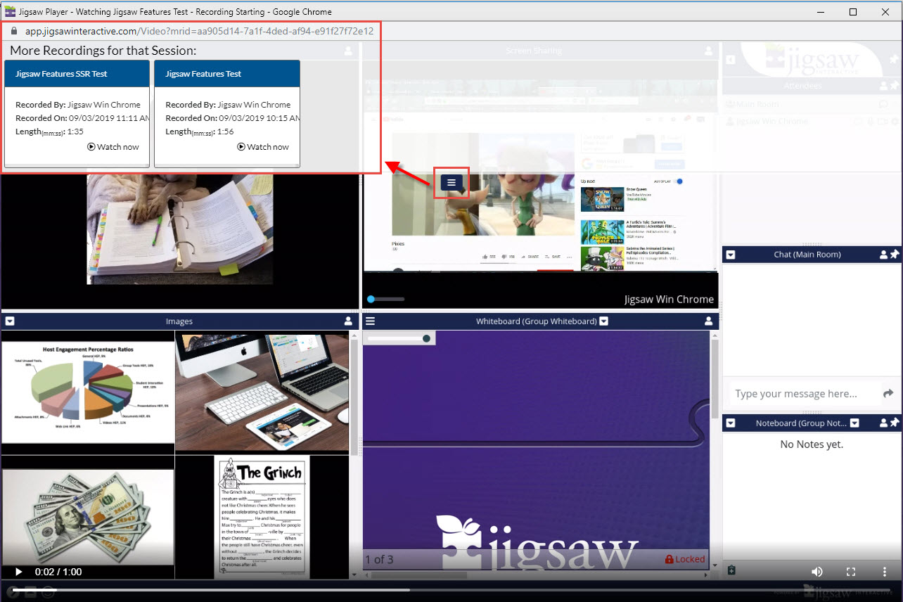 Located at the top middle of the Recording screen, there are three vertical lines. By clicking this menu, a list of available recordings will appear at the top of the screen for the viewer related to that session. In order to see this list, viewers must be logged into their Jigsaw account AND have permissions to view the recordings.