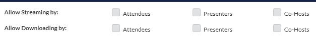 Allow Streaming By and Allow Download By give attendees and presenters access to the Watch Now and Download buttons in their Jigsaw Recorded Sessions tab.