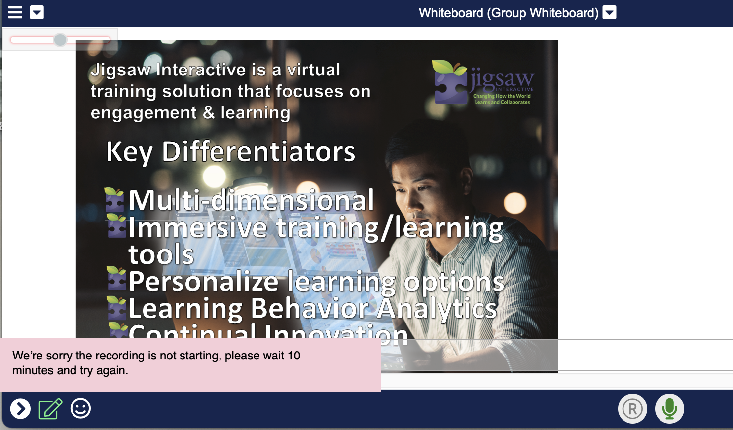 - If the Session Side Recording fails to start in the Main Room and the Host/Co-Host is located in the Main Room, they will receive the following notification: