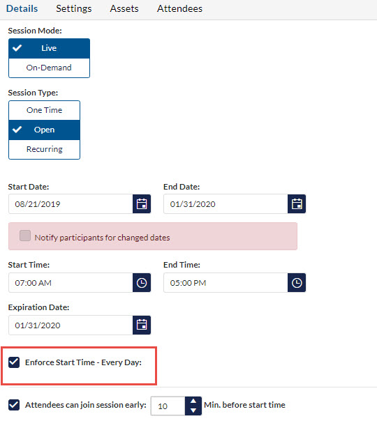 Have you noticed your students are arriving in your sessions long before you even though you selected the option for Attendees to join the session early: 10 minutes before start time when you set up the session? This is because that option is only good for the first session of a Live > Open Session. Never fear! There is a new option available that will enforce this for every session called Enforce Start Time - Every Day. Just check the box after setting your dates and times and you are set to go!